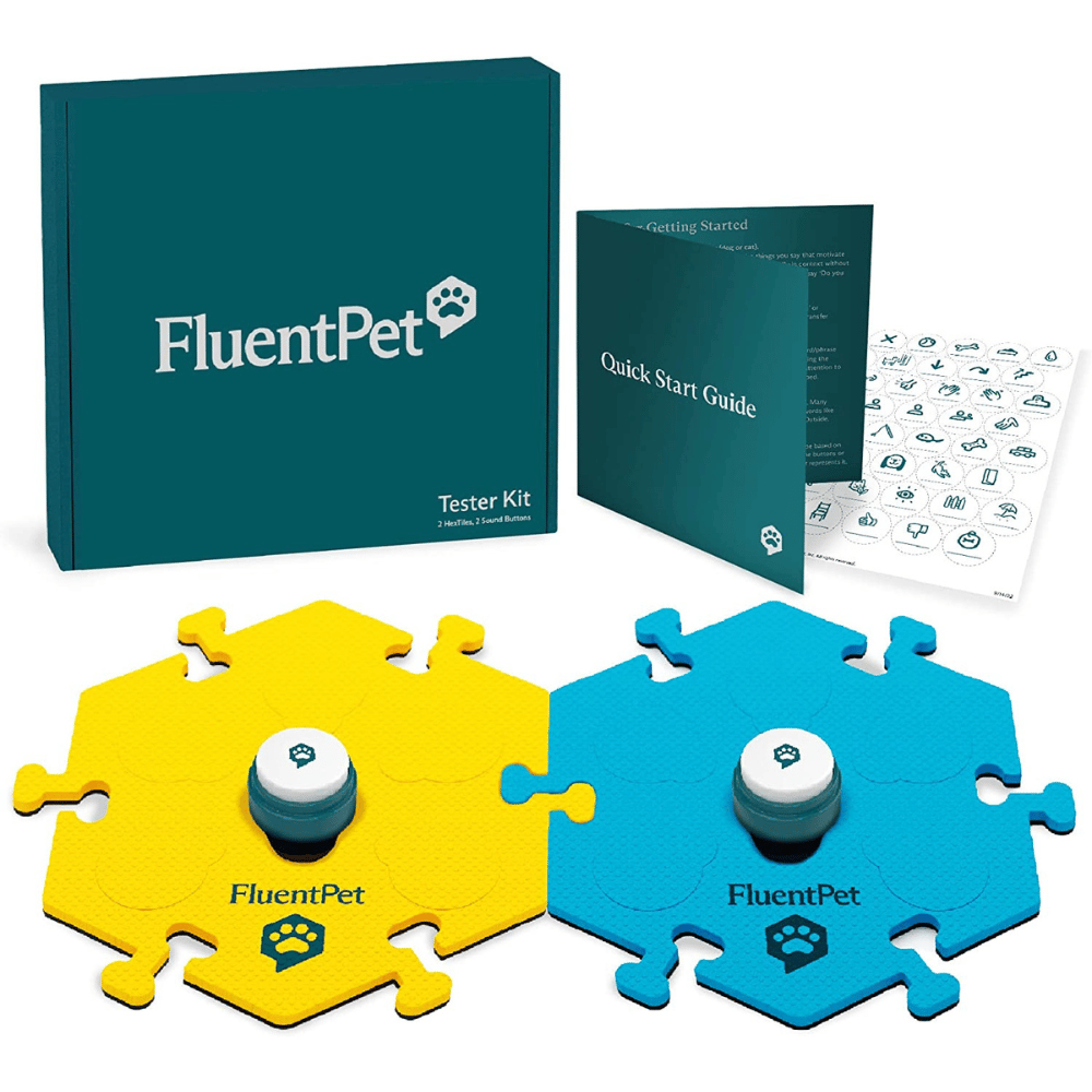 The kit includes 12 FluentPet dog talking buttons, 6 HexTiles, and 67 stickers to label the buttons. The included AAA batteries are pre-installed in the buttons so that you can use them immediately. Each HexTile holds up to 6 talking pet buttons, and the set can be easily expanded by adding additional Fluent Pet buttons and HexTiles.