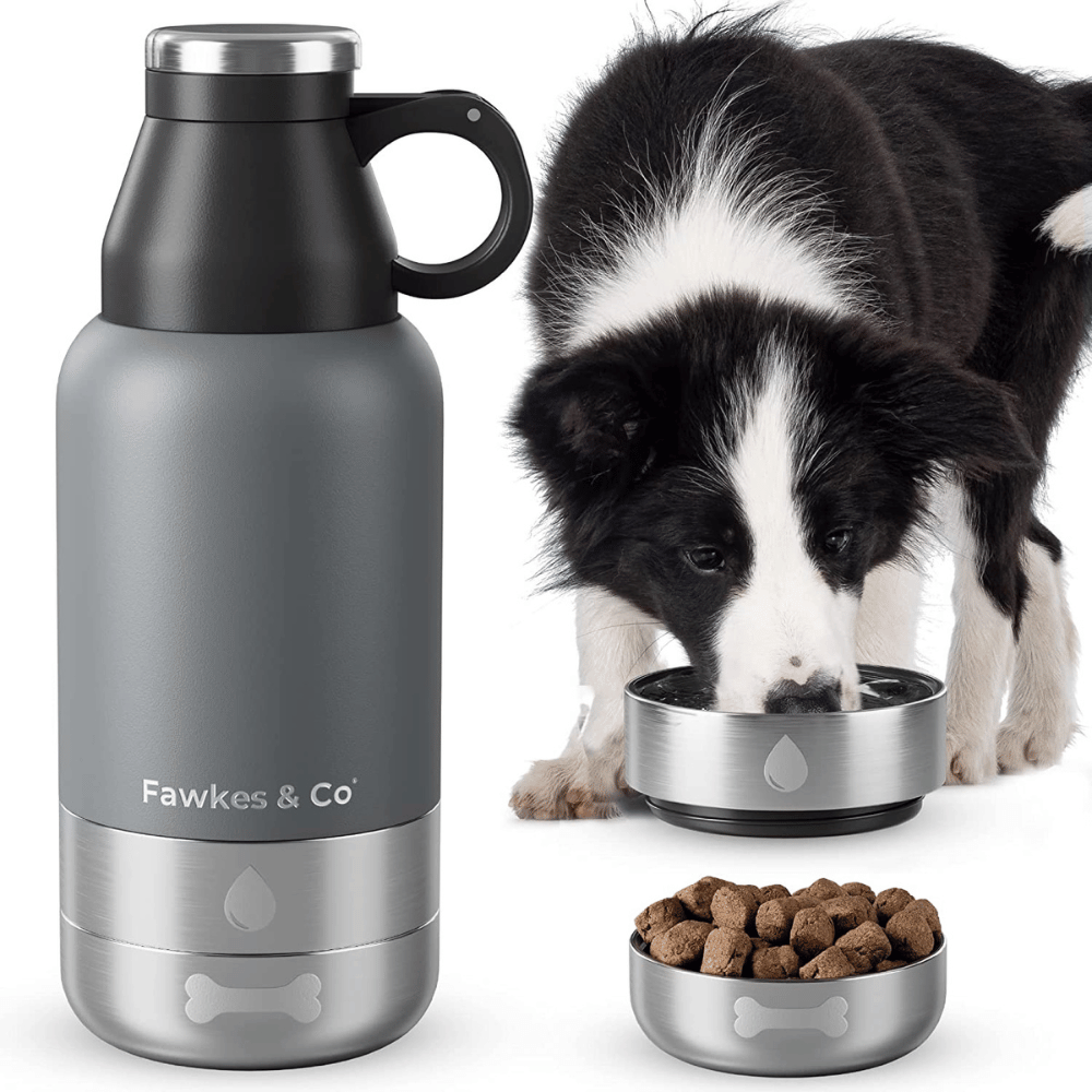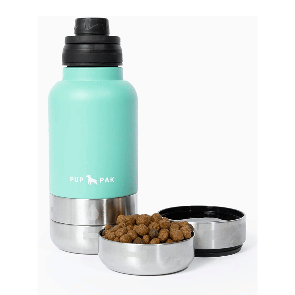 The Pup Pak 32 oz. Dog Water Bottle with Detachable Bowls is adorable and convenient. It weighs only 1 pound and comes equipped with two bowls: one for food and one for water. The stainless steel double-wall insulation means you can fill it up with ice-cold water to keep your pup cool during those hot summer days, and rest assured that the water will remain cold overnight so your pup is well-hydrated in the morning.