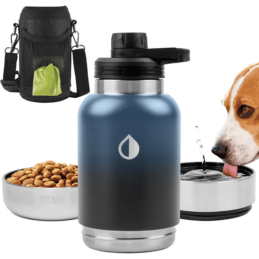 The HEMLI 32 oz. Dog Water Bottle is insulated with a double-walled vacuum seal to keep your pup's water cold and refreshing for up to 24 hours. It also comes with two detachable bowls - an 8 oz. water bowl and a 7 oz. pet food bowl - making it easy to keep your pup hydrated and fed throughout a long day of exploring nature together.