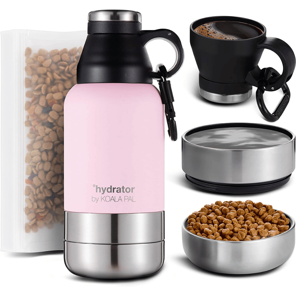 The KOALA PAL 32 oz. Insulated Dog Water Bottle & Travel Bowls includes everything you need to keep your furry friend hydrated when you two are out and about. This kit includes a water bottle, detachable dog food & water bowls, and a drinking cup with a twist top lid. The drinking cup means you won't have to worry about cross-contamination between your drink and your pet's water.