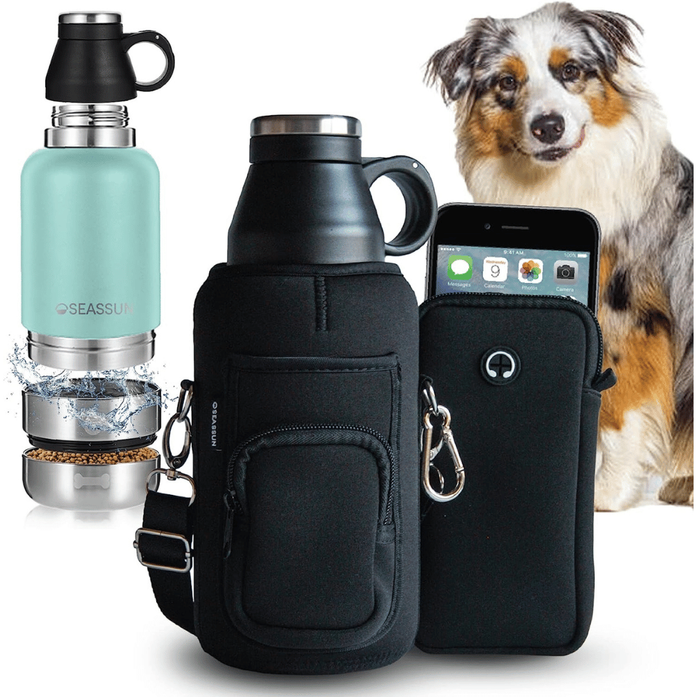 The insulated SEASSUN 32 oz. Dog Water Bottle & Dog Walking Bag comes with two travel dog bowls and is designed to keep water at the perfect temperature. The package also includes a waterproof neoprene sling bag with several pockets, including a pouch for dog treats.